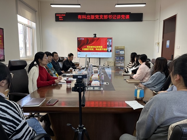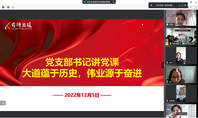 12月5日,有科出版黨支部書記錢九紅講授題為《大道蘊(yùn)于歷史,偉業(yè)源于奮進(jìn)》的專題黨課。全體黨員群眾參會(huì),會(huì)議通過線上線下同步召開。